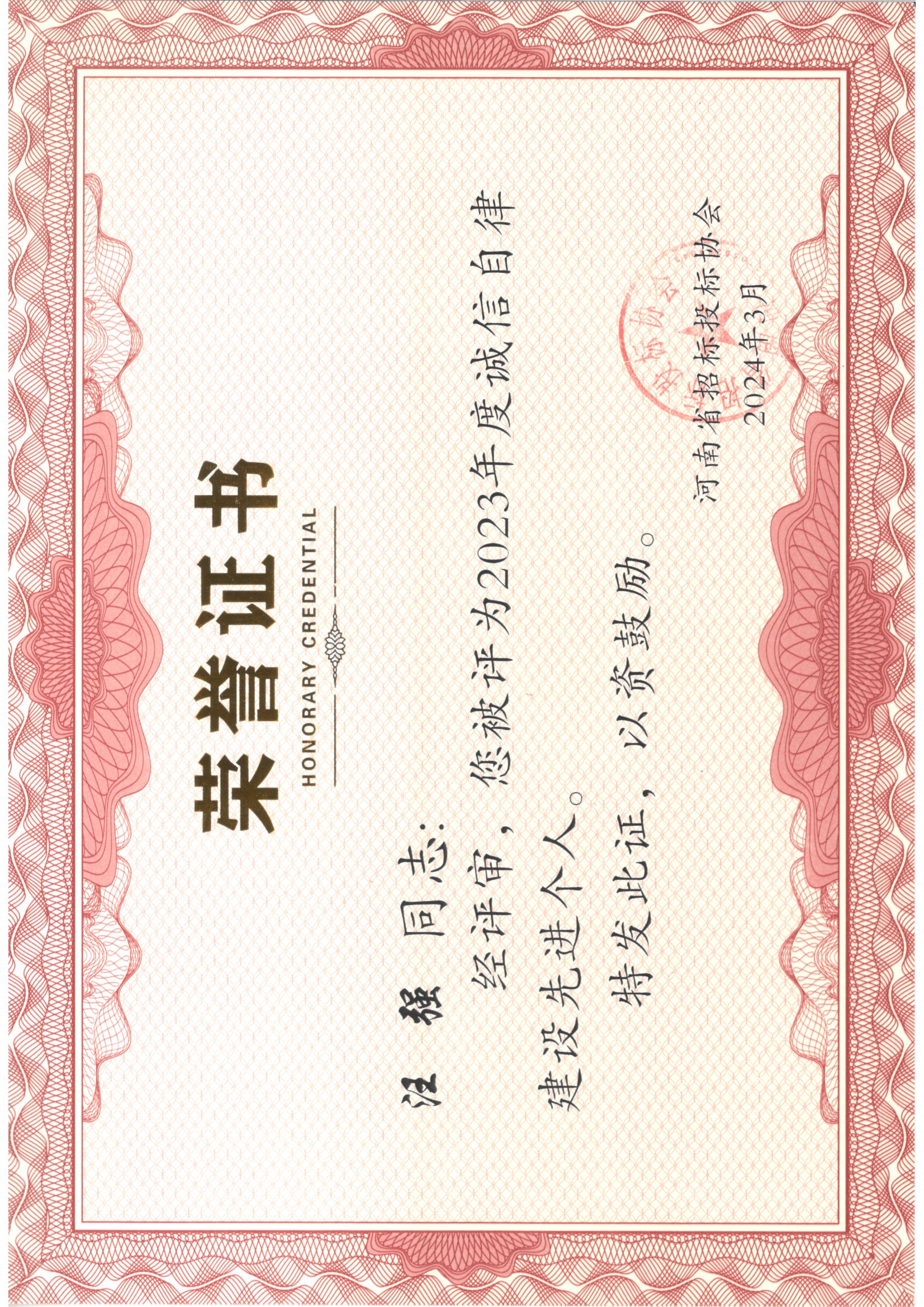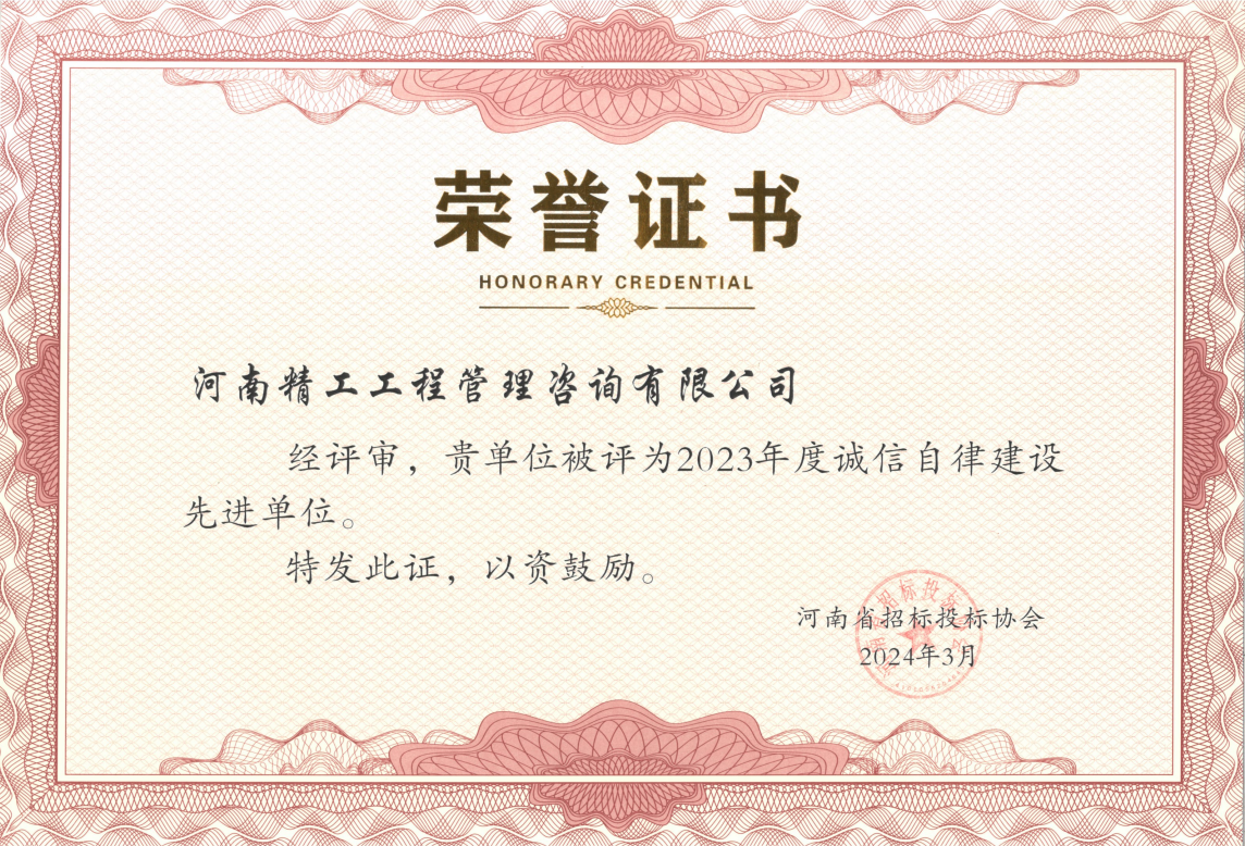 近日,河南省招標投標協會發布了《關于表彰2023年度誠信自律建設先進單位、先進個人的決定》(豫招協[2024]003號),河南精工工程管理咨詢有限公司再次被評為“2023年度誠信自律建設先進單位”,公司員工李鑫、汪強榮獲“2023年度誠信自律建設先進個人”榮譽稱號。