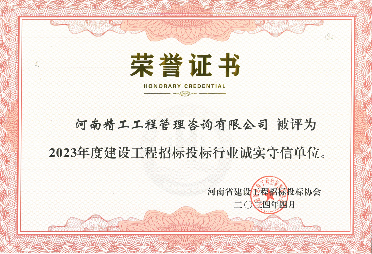 近日,河南省建設(shè)工程招標投標協(xié)會發(fā)布了關(guān)于公布2023年度建設(shè)工程招標投標行業(yè)誠實守信單位的通知(【豫建招協(xié)字〔2024〕11號】),河南精工工程管理咨詢有限公司榮獲“2023年度建設(shè)工程招標投標行業(yè)誠實守信單位”榮譽稱號。