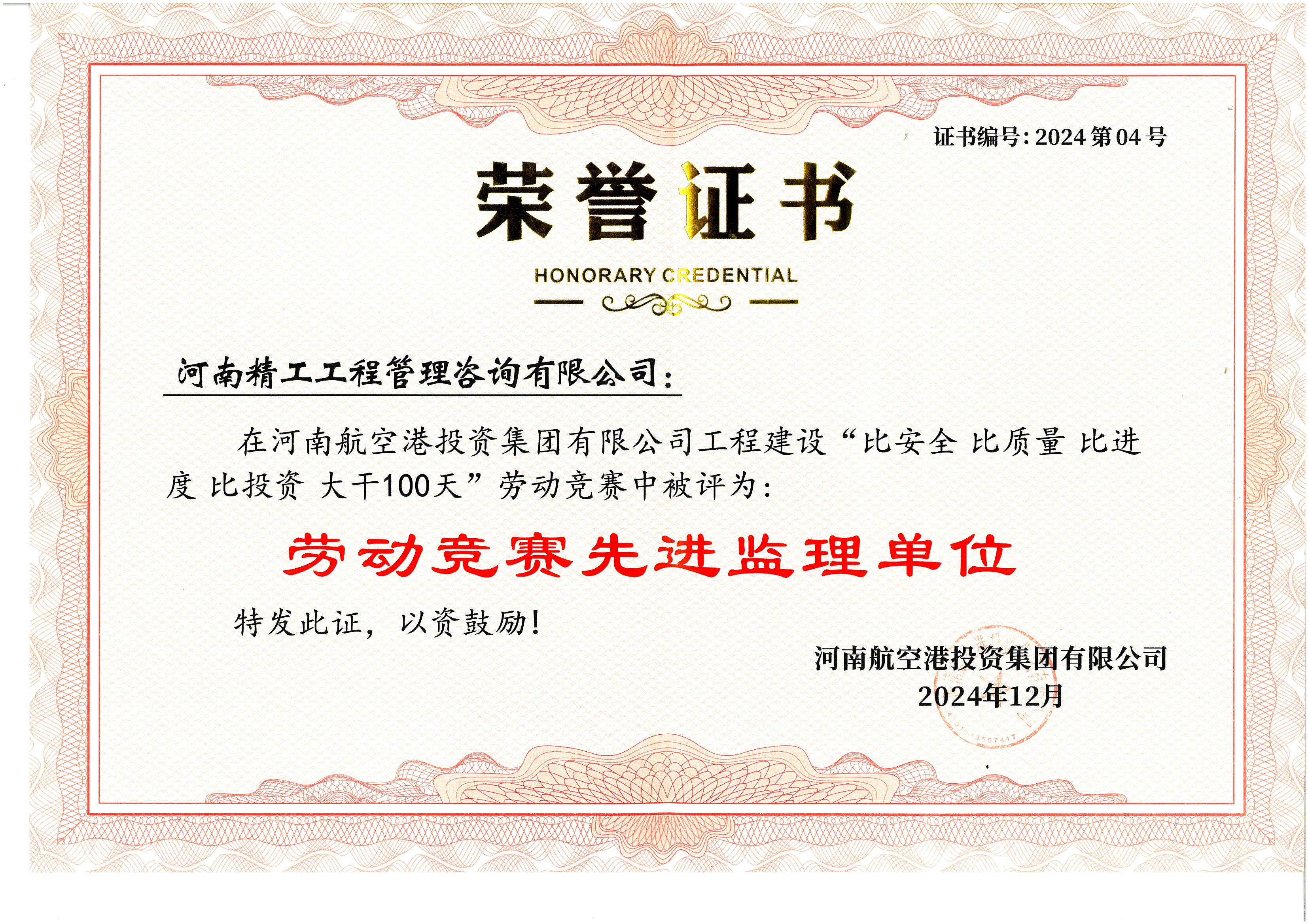 2024年12月,河南精工工程管理咨詢有限公司所監(jiān)理的大寨安置區(qū)項(xiàng)目在河南航空港投資集團(tuán)有限公司工程建設(shè)“比安全 比質(zhì)量 比進(jìn)度 比投資 大干100天”勞動(dòng)競賽中名列前茅,我單位被榮評(píng)為“勞動(dòng)競賽先進(jìn)監(jiān)理單位”。